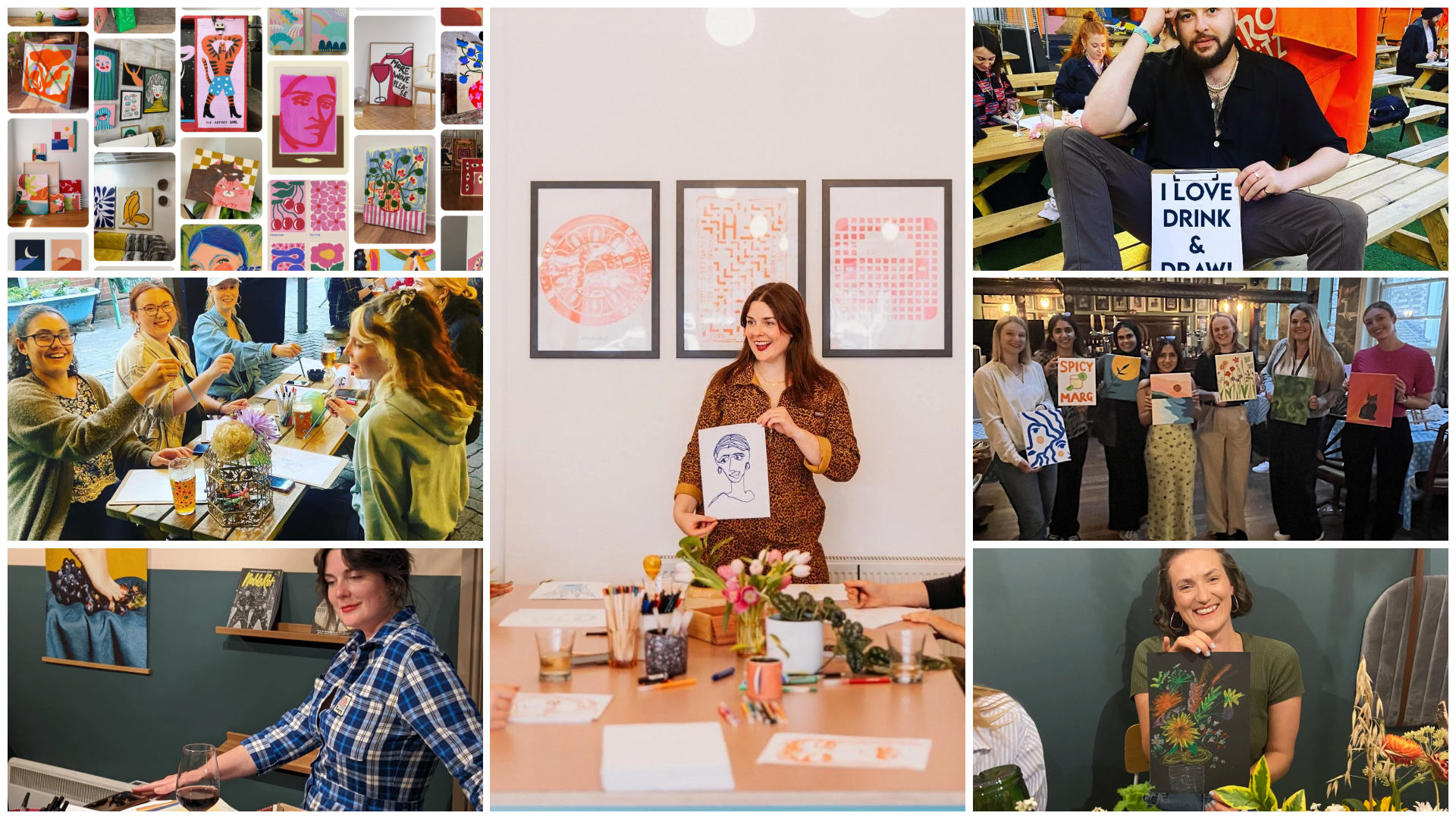 Felicity (Flic) Blades is a Birmingham-based artist who believes creativity should be fun, accessible, and good for wellbeing. After studying Womenswear Design at UAL and working in fashion, she founded her own creative events business to help people reconnect with their artistic side. What began as a “Drink & Draw” evening has grown into workshops ranging from collage nights to drag life drawing and team-building sessions. Her focus is on making art approachable for everyone – less about technique, more about enjoying the process!